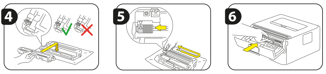 5. Hold the toner cartridge by the handle and push it along the tracks until it clicks into place.