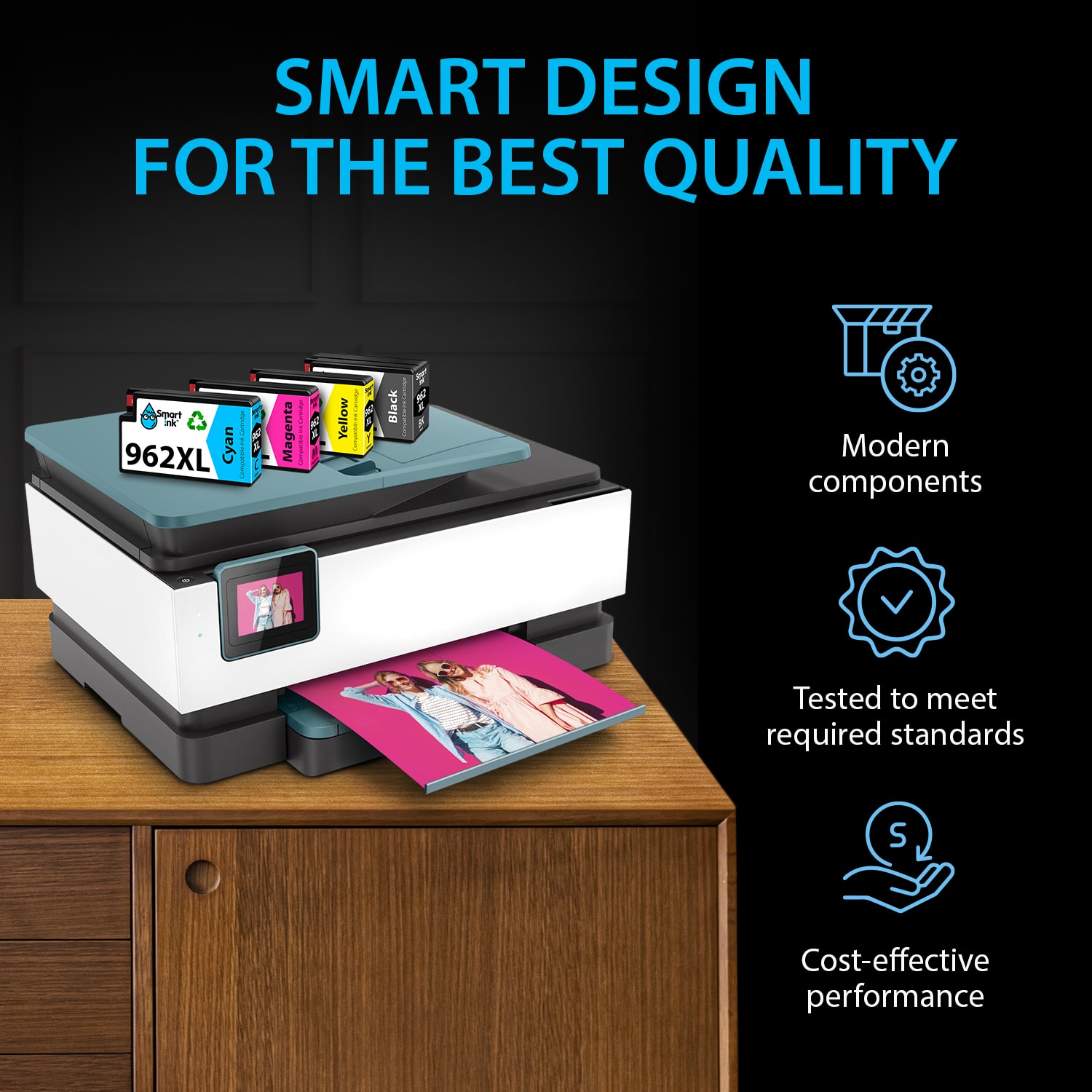 - Designed for Quality: Smart Ink compatible cartridges are manufactured with brand-new components and carefully tested to produce sharp, saturated printing results.