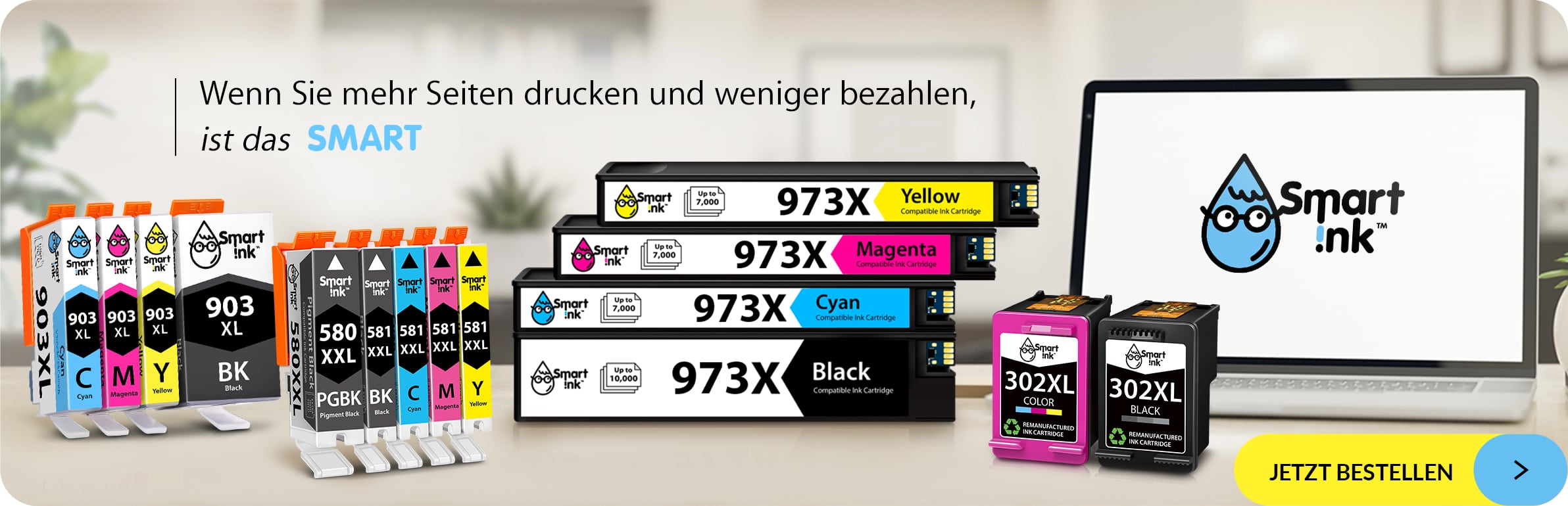 Smart Ink produziert und vertreibt kompatible Tintenpatronen für Drucker der gängigsten Marken. Unsere Tinten sind auf maximale Effizienz ausgelegt, d.h. Sie erhalten bessere Ergebnisse zu einem Bruchteil des Preises, den Sie für Originalpatronen zahlen würden.