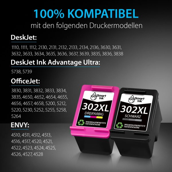 - Ausgezeichnete Druckqualität. Smart Ink 302XL-Tintenpatronen werden von OEM-Produkten wiederaufbereitet, professionell gereinigt, wiederbefüllt und getestet, um Ihnen die gleiche Druckqualität wie die Original-Tintenpatronen zu bieten.
