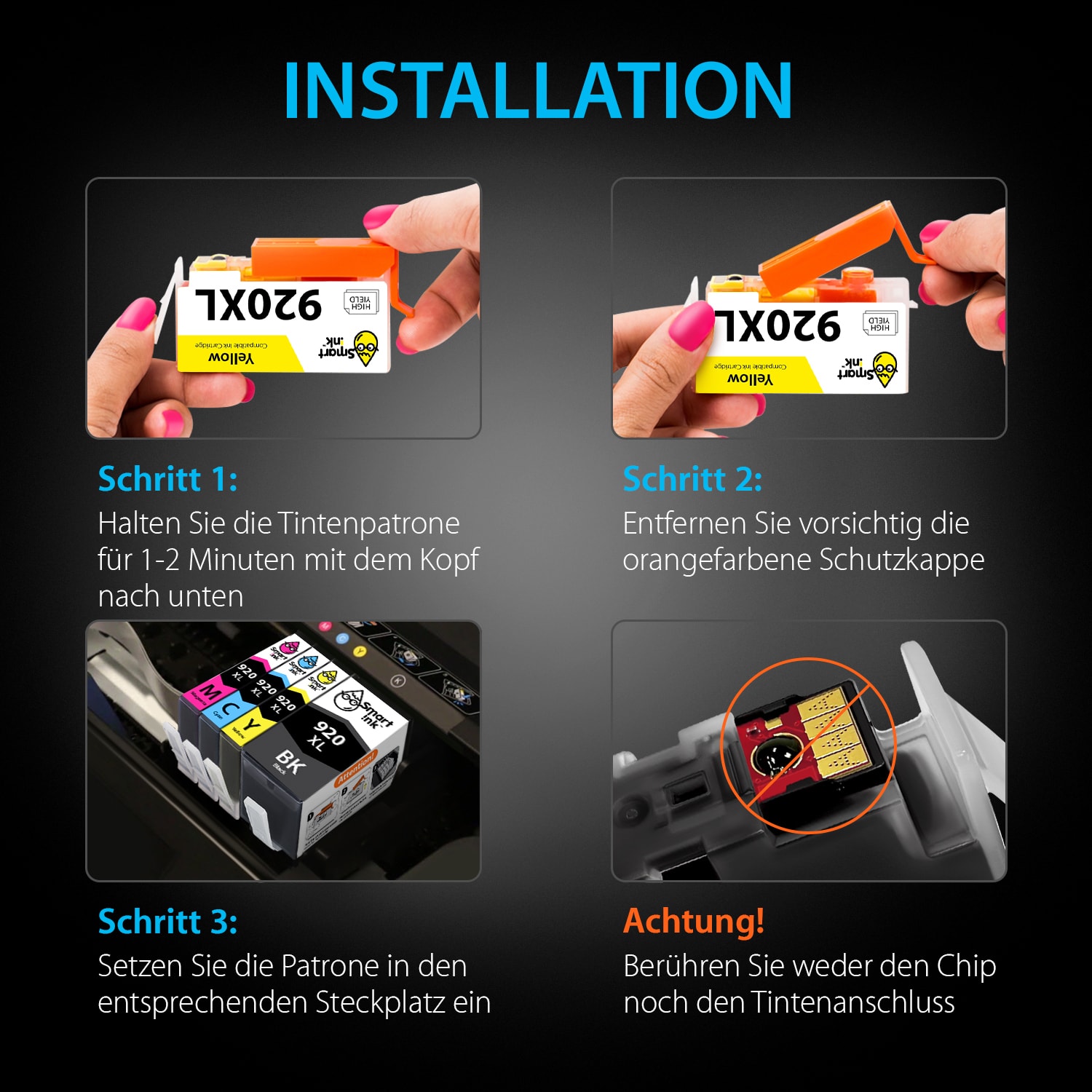 - Die Ersatz-Patronen HP 920XL Schwarz/Cyan/Magenta/Gelb funktionieren sofort nach der Installation