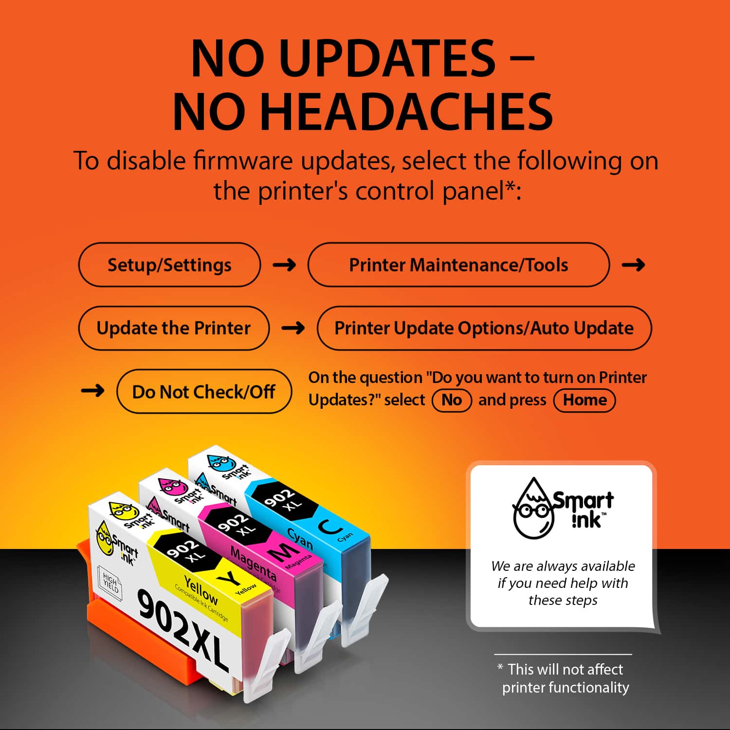 Always the Latest Chip Version: Smart Ink cartridges are equipped with the most up-to-date version of the chip and work perfectly with all compatible printers, including printers with the latest firmware.