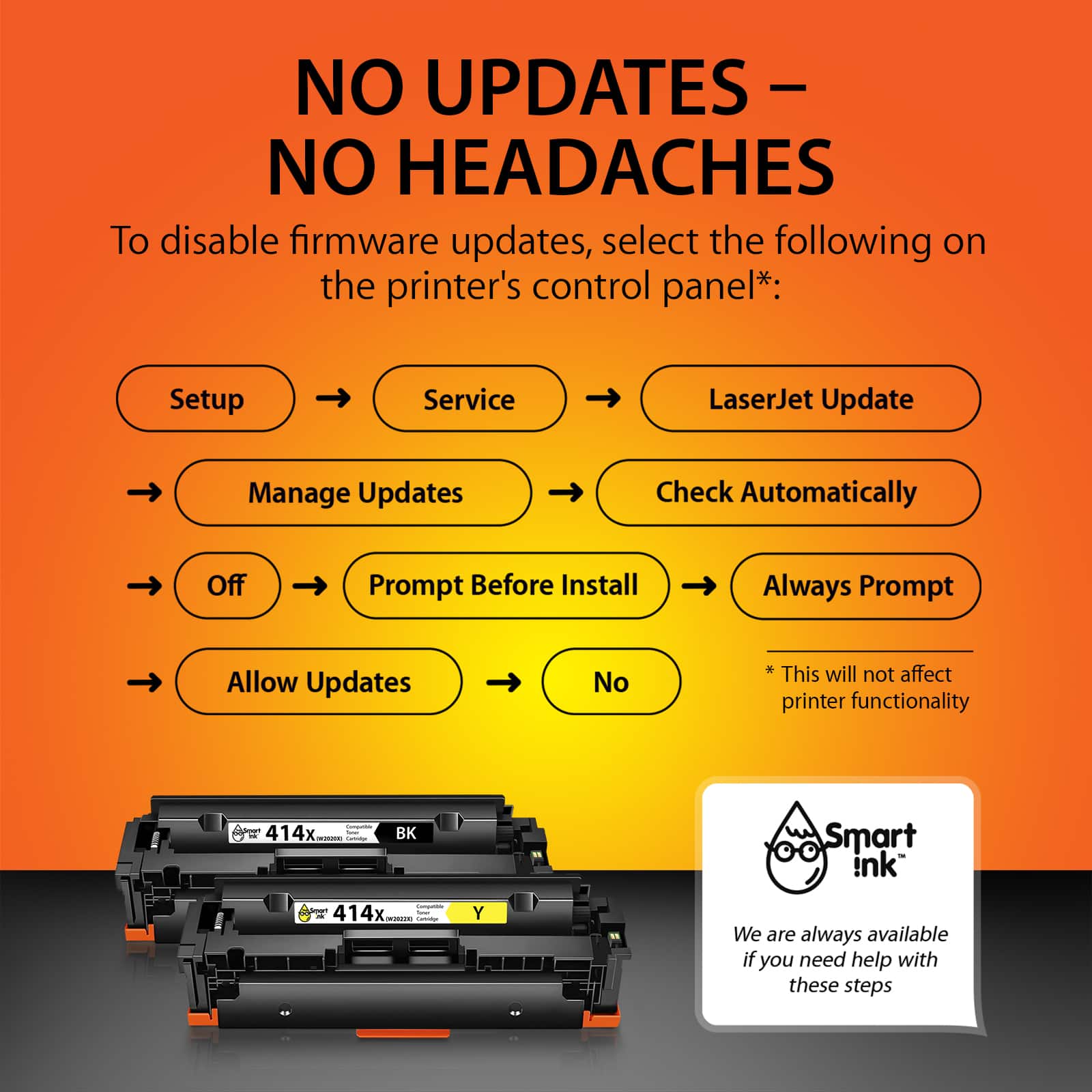 • Always the Latest Chip Version: Smart Ink 414X HP replacement toner cartridges are equipped with the most up-to-date version of the chip and work perfectly with all compatible printers, including printers with the latest firmware.