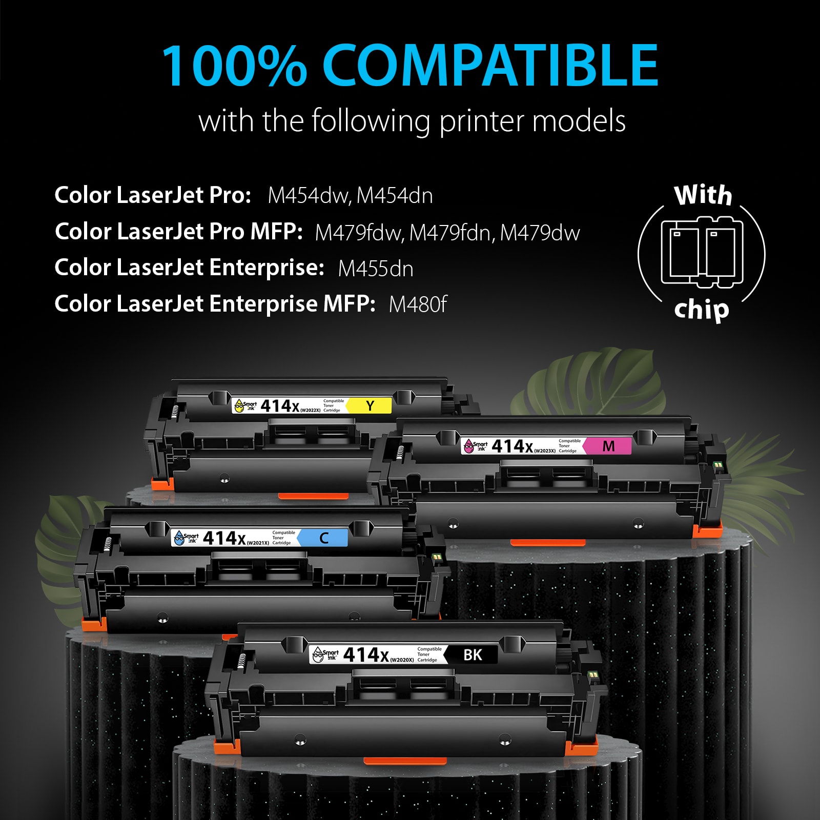 - Always the Latest Chip Version: Smart Ink 414X HP replacement toner cartridges are equipped with the most up-to-date version of the chip and work perfectly with all compatible printers, including printers with the latest firmware.
