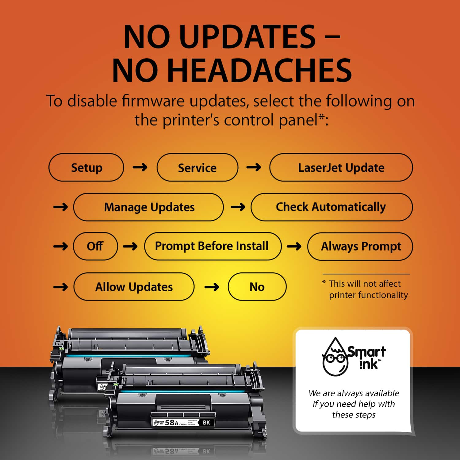 Always the Latest Chip Version: Smart Ink 58A HP toner replacement cartridges are equipped with the most up-to-date version of the chip and work perfectly with all compatible printers, including printers with the latest firmware.