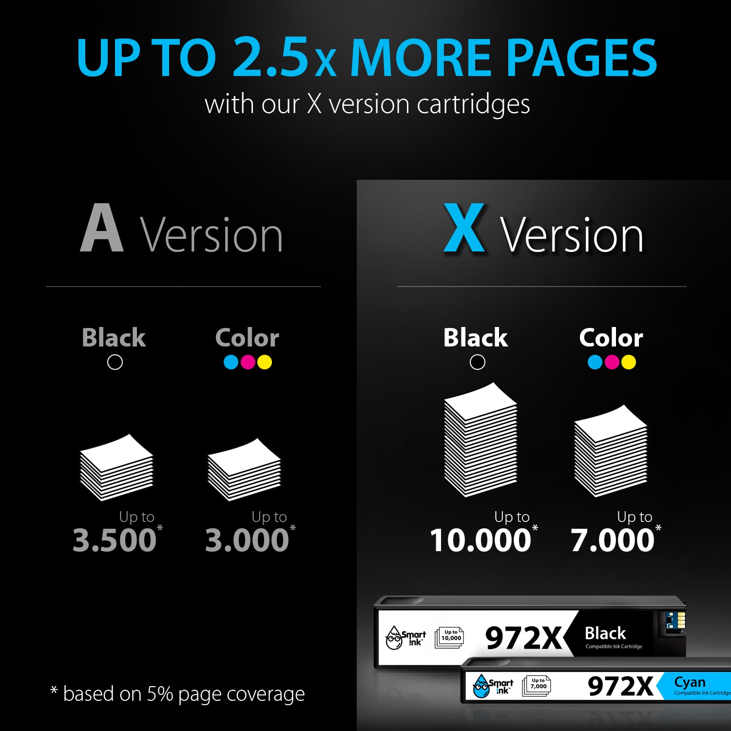 - 2,5x more pages with X version of the HP 972 ink replacement 4 pack