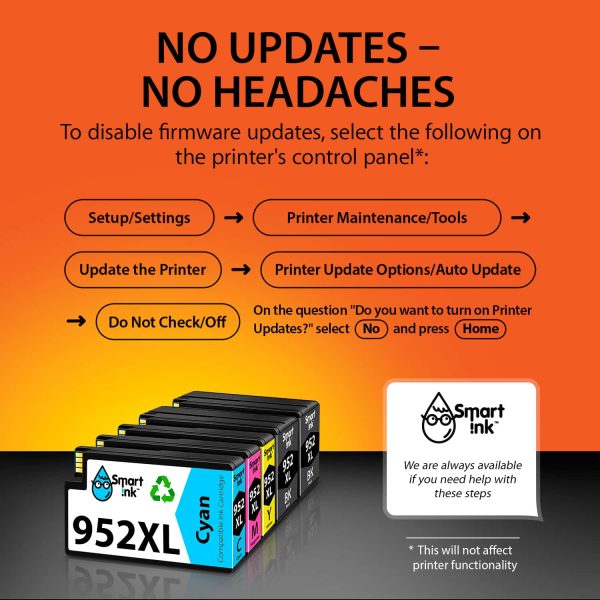 - Always the Latest Chip Version: Smart Ink HP 952 ink cartridges are equipped with the most up-to-date version of the chip and work perfectly with all compatible printers, including printers with the latest firmware.